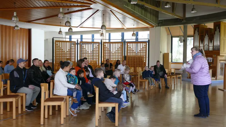 Gespannt lauschten 16 kleine Entdeckerkinder (ein paar weitere kamen später noch dazu) der Geschichte vom kleinen Osterhasen Lino, die Pastoralreferentin Tina Reschreiter – mit einem Stoffhasen auf dem Arm – erzählte. Die kleinen Mädchen und Jungen waren zusammen mit ihren Eltern und einigen Omas ins evangelische Gemeindezentrum gekommen, eingeladen von den beiden christlichen Gemeinden in Klarenthal.