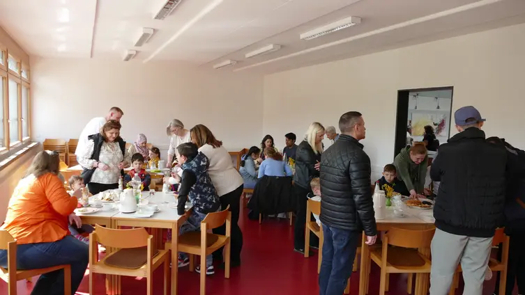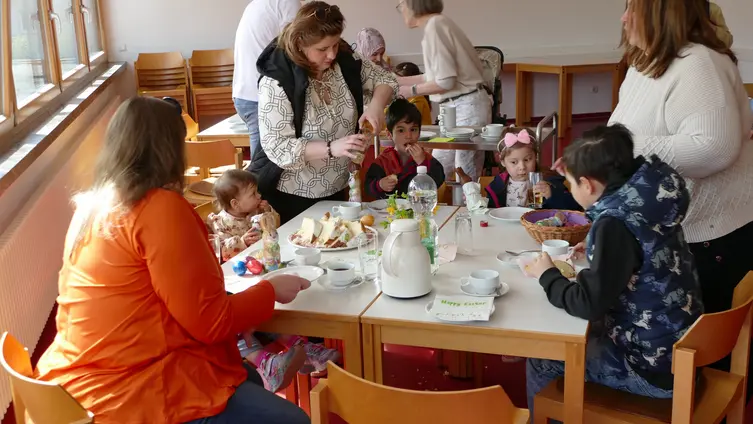Für das leibliche Wohl der Erwachsenen waren im Konfi-Raum Tische österlich gedeckt mit Osterbrot, Kaffee und Säften für die Kinder. Und zum Abschluss gab es noch für jedes Kind einen Schoko-Osterhasen.