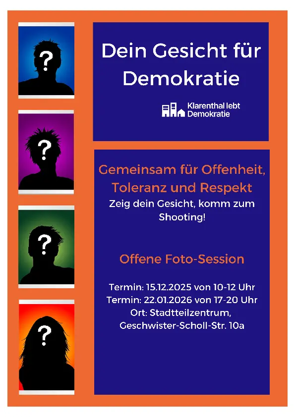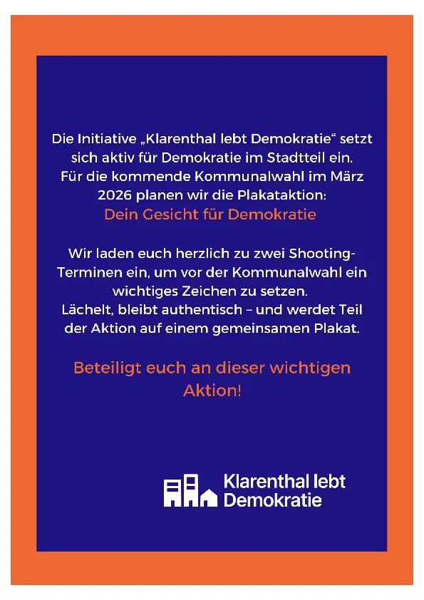 Gerne schließen wir uns dem Aufruf der Initiative Klarenthal lebt Demokratie an, die in einer kreativen Fotoaktion Klarenthalerinnen und Klarenthaler darum bittet “Gesicht zu zeigen” und für ein offenes und demokratisches Miteinander im Stadtteil einzustehen.