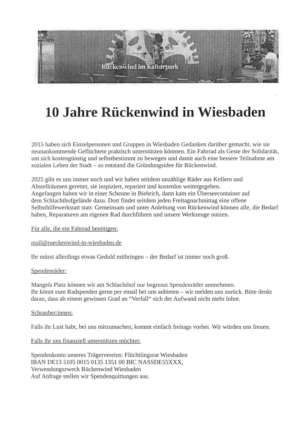 Haben Sie sich schon einmal gefragt, wie viele ungenutzte, aber durchaus brauchbare Fahrräder in Klarenthals Kellern und Garagen herumstehen? Andererseits gibt es Menschen, die sich über einen solchen fahrbaren Untersatz riesig freuen würden. Deshalb unterstützen wir gerne die Aktion RÜCKENWIND, die gebrauchte Fahrräder aufarbeitet und Bedürftigen oder Geflüchteten zur Verfügung stellt.